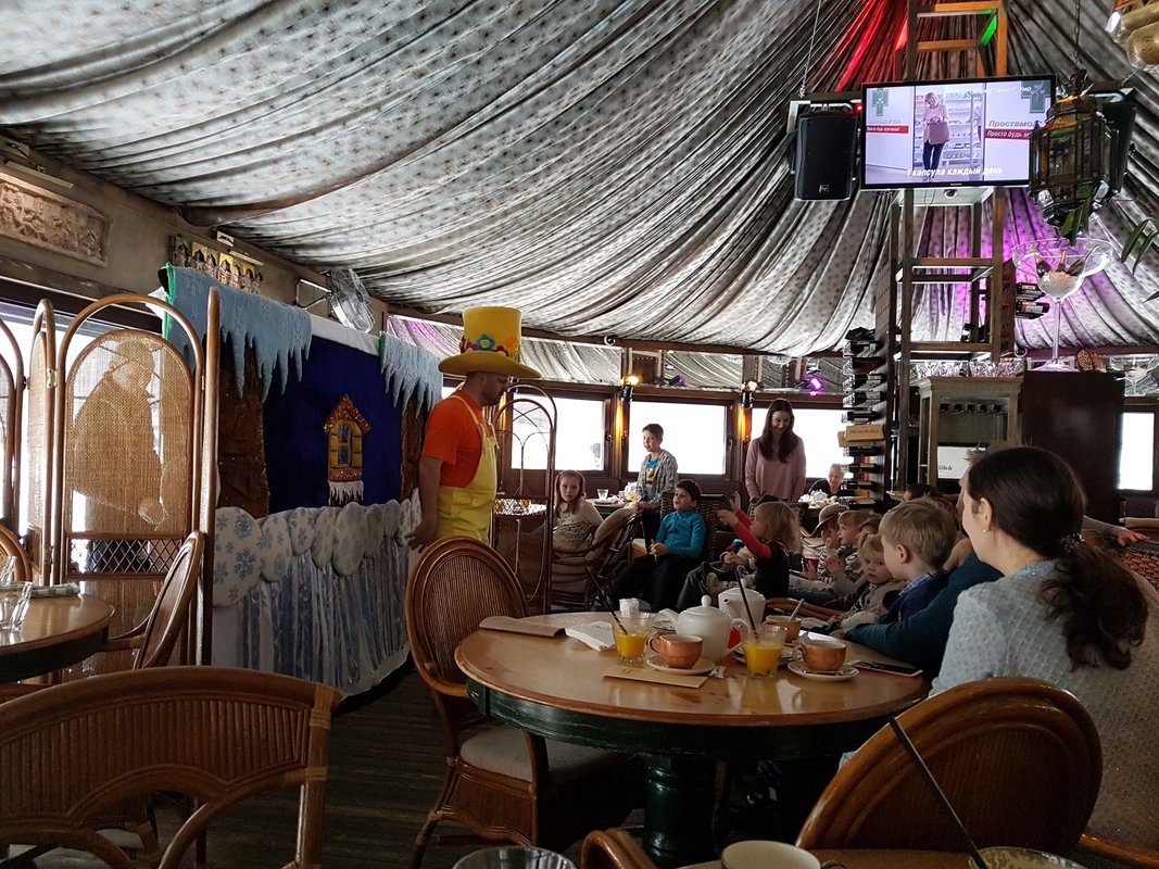 Наша дружная компания 4 ноября - в субботу побывала в гостях в данном ресторане.Все в принципе норм.Еда как еда и по вкусу и по цене.Хотя много того ,что называется наименованием блюд, но вкус от шефа-повара и от заведения.Внутренне убранство норм,правда грязные сидушки и пледы.Очень не удобные туалеты.маленькие .Официант Кирилл все как мог хорошо нас обслуживал.но больше разочаровало на выходе ожидание пока старенький гардеробщик при людно переоденется и переобуется и начал выдавать пальто гостям.Тут конечно не до сервиса и очередности.Он очень видимо старенький, плохо видящий. Уважаемая администрация,мне кажется сейчас много разных примеров как можно современно организовать гардероб.Не мучайте старичка, это смотрится не очень и типа специально такого поставили вызвать какие то эмоции. Хотя рядом стоят здоровые парни - кальянщики и ржут. Гардероб нужен -это бесспорно. Но мучить старика - это не очень. Стыдно было очень перед иностранцами.